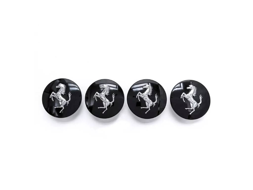Genuine set of 4 Ferrari centre wheel caps, black glossy cap embossed silver iconic prancing horse. Suitable for all Ferrari Models with Standard Size Wheel Centre
